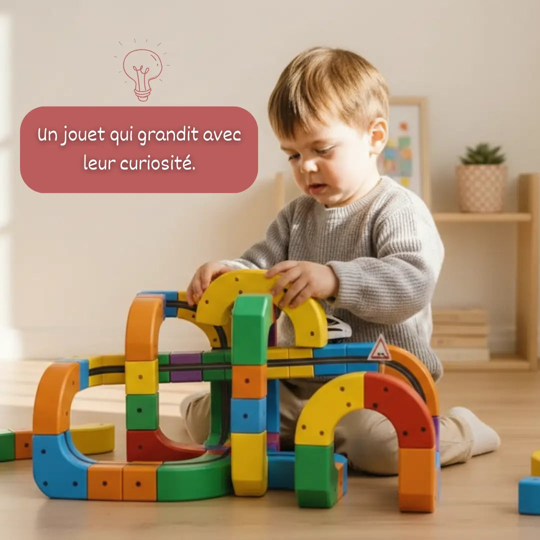 Ce circuit de cubes STEM innovant permet aux enfants de créer leur propre univers de course passionnant où l'imagination n'a pas de limites. Les enfants peuvent construire d'incroyables parcours en 3D en combinant les cubes à leur guise, créant des loopings défiant la gravité et des circuits palpitants. Ce jeu développe des compétences essentielles tout en offrant des cascades spectaculaires, une action sans relâche et un plaisir infini qui transforme chaque moment de jeu en un souvenir inoubliable. Ce circuit est conçu pour durer, restant résistant même lors des courses les plus extrêmes. Les composants en ABS robuste supportent les collisions, les sauts et les manœuvres audacieuses, permettant aux enfants de jouer sans crainte de casse ou de pièces endommagées. Les parents apprécient les jouets durables qui évitent les déceptions, faisant de celui-ci un choix adoré pour les années à venir. Au-delà du divertissement, ce jouet stimule d'importantes compétences de développement de la manière la plus amusante qui soit. Les enfants apprennent la notion de direction, d'équilibre et la perception spatiale en construisant des circuits créatifs. Leurs mains restent actives et leur imagination grandit à chaque course. Par essais et erreurs, les enfants découvrent ce qui fonctionne et ressentent de la fierté quand les voitures réussissent enfin les loopings, renforçant leur confiance à chaque session de jeu. Le circuit est rechargeable par USB et convient aux enfants à partir de 3 ans.